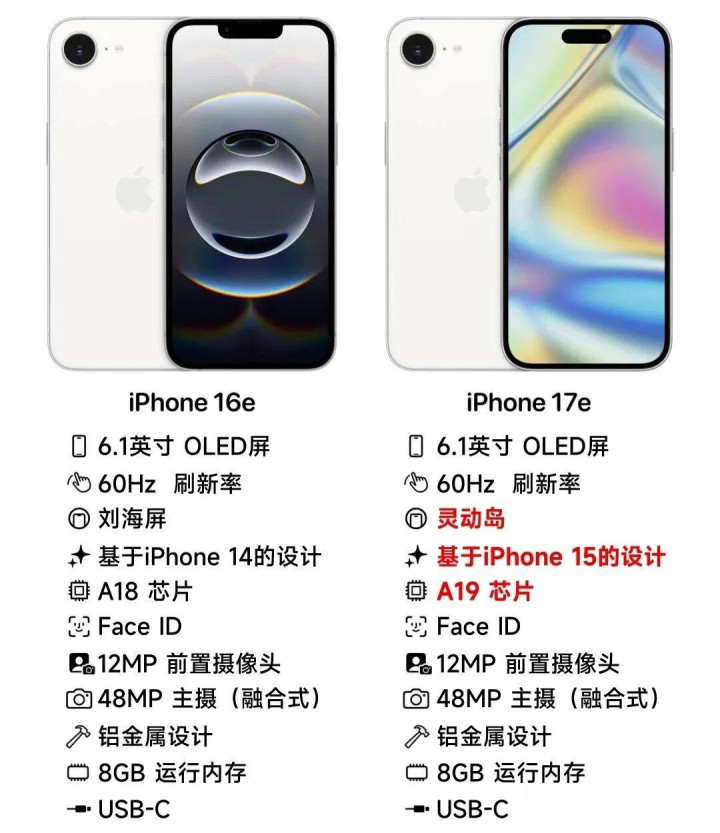 综合多方爆料,iPhone 17e 相比上一代 iPhone 16e,整体变化不大,主要在外观和配置上有两处升级: