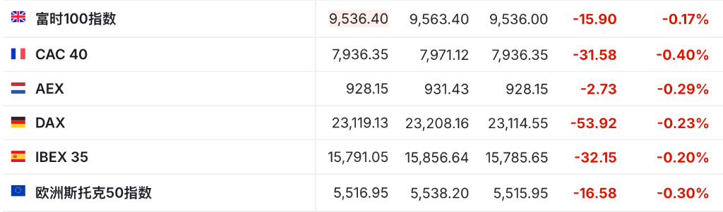 欧股指集体承压,欧洲斯托克50指数跌幅扩大至0.3%