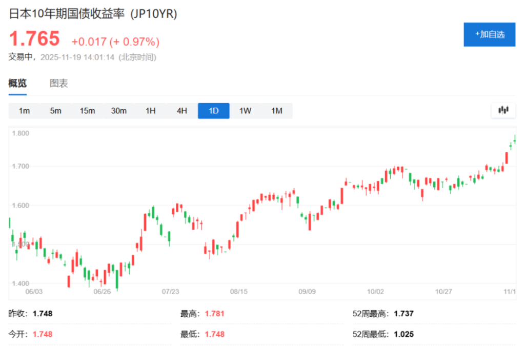 日本10年期国债收益率攀升2个基点至1.765%,创下自2008年6月全球金融危机以来的最高水平。